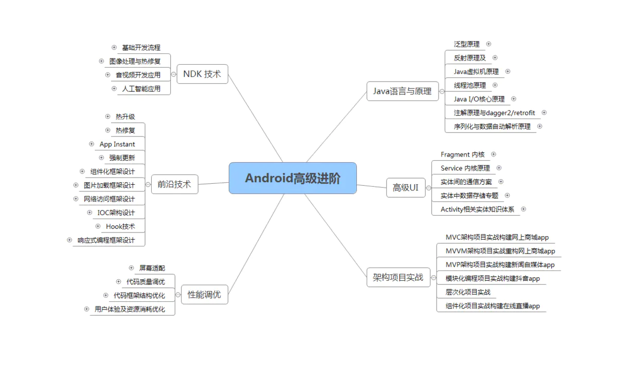 我搜集整理过这几年阿里,以及腾讯,字节跳动,华为,小米等公司的面试题,把面试的要求和技术点梳理成一份大而全的“ Android架构师”面试 Xmind(实际上比预期多花了不少精力),包含知识脉络 + 分支细节。
