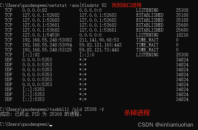 第一步:输入netstat -ano查找所有端口(一般这一步都看不到自己想要的端口)