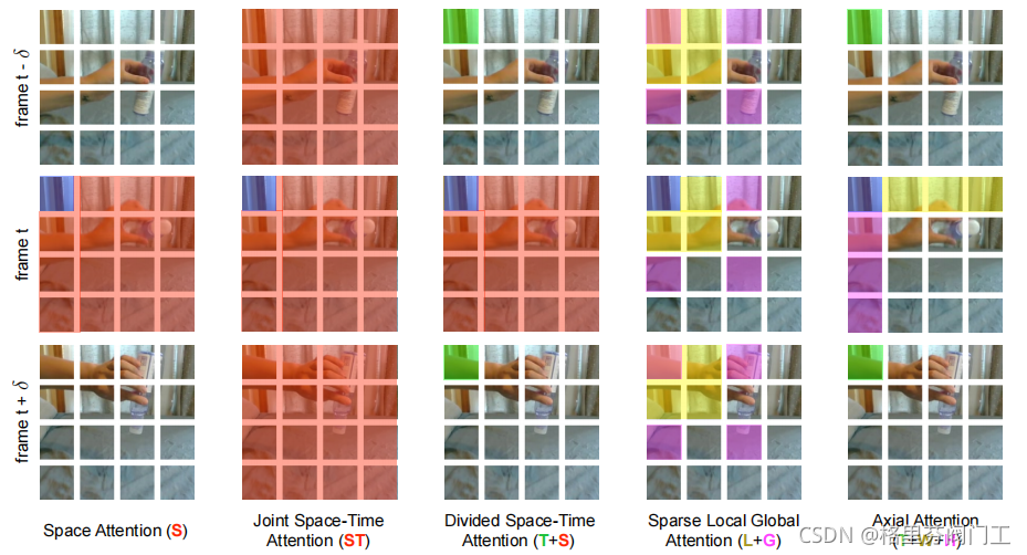在上图中,蓝色为所要查询的格子,红色等其他颜色为注意力覆盖区域,没上色的表示计算注意力时没关注这些格子。传统的ViT只关注目前这一帧的其他区域,而本文会关注前后帧的信息。