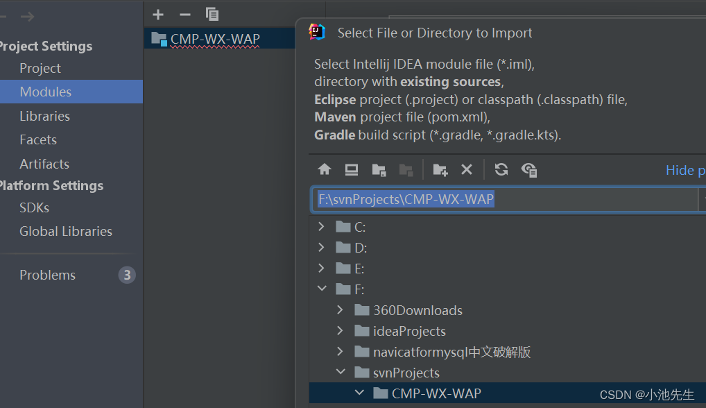 选择eclipse 一直下一步就行这样就出来了。选择import module。因为没有导入modules。