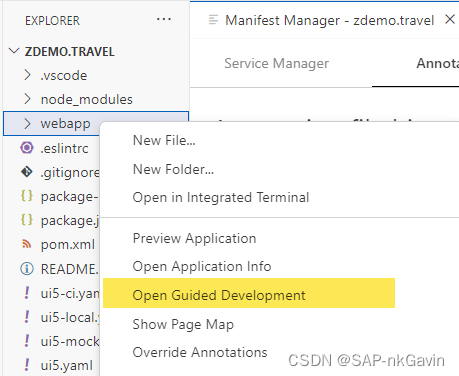 通过有Guided Development,可以查看如何在SAP Fiori元素应用程序中实现某些功能的指南和教程。可以使用命令面板的 Fiori: open Guided Development 命令,或邮件webapp文件夹打开此功能。