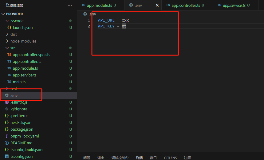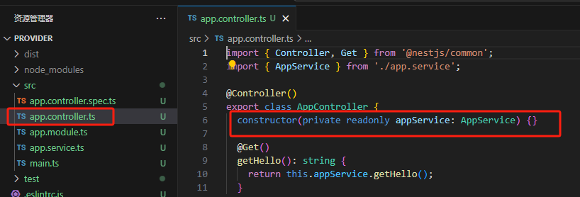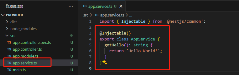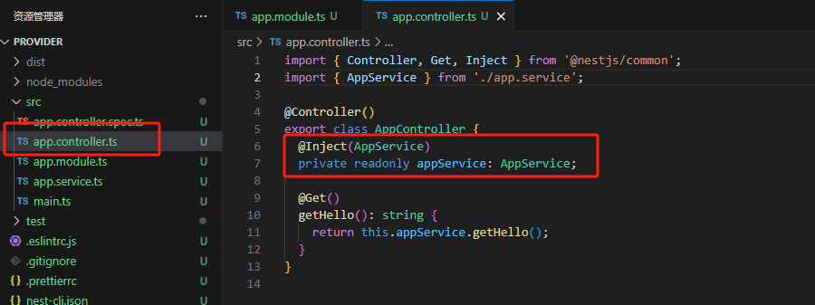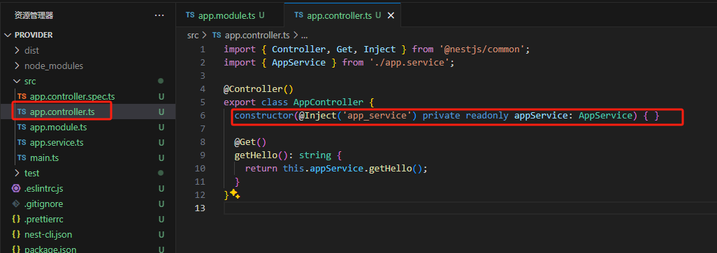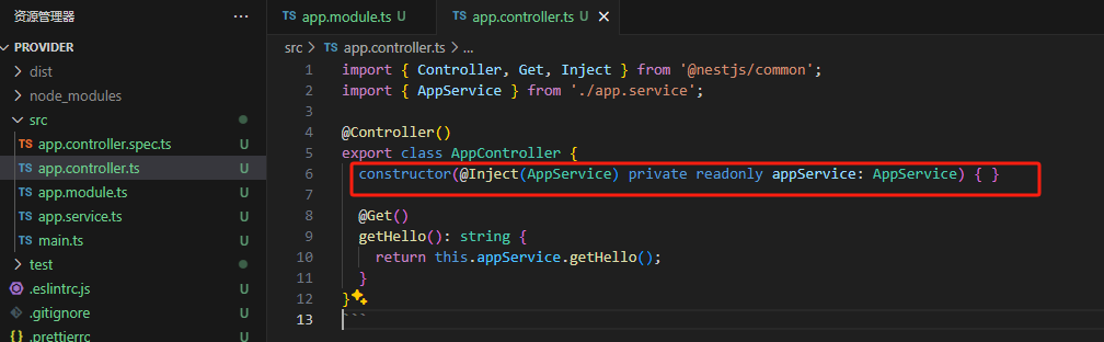 在 Module 的 providers 里声明,在 AppController 的构造器里参数里声明了 AppService 的依赖,就会自动注入。