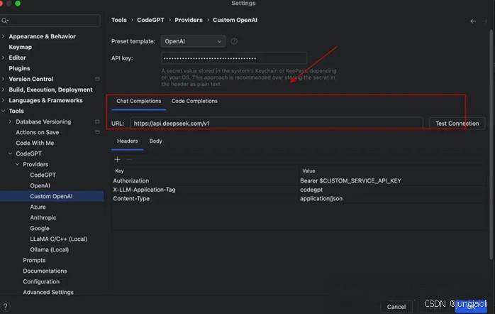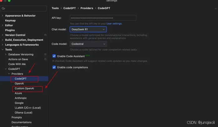 激活插件之后,进入 Settings 页面,找到 Tools > CodeGPT,点击 Providers,选择 Custom OpenAI 或 CodeGPT。然后配置对应的 DeepSeek 模型和 API Key。