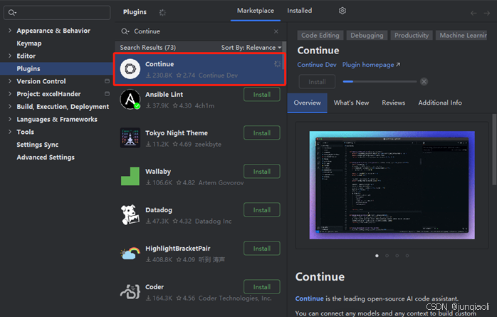 - 进入 Plugins,在搜索框中输入 Continue,找到插件并安装。