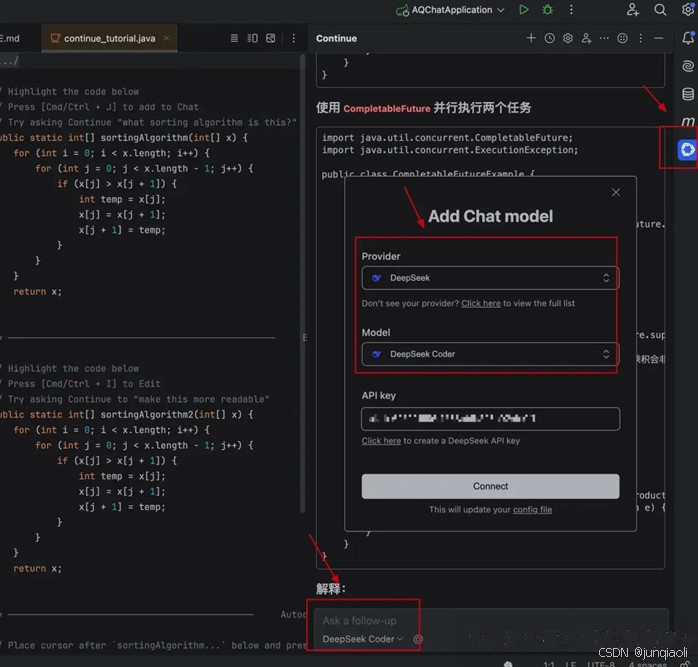 首先,咱们来聊聊如何用 Continue 插件接入 DeepSeek。这是一个开源的 AI 助手插件,专门为 IntelliJ IDEA 量身定制。简单来说,它能让你通过自然语言与代码互动,让开发更加高效。