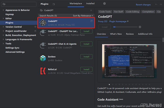 - 进入 Plugins,在搜索框中输入 CodeGPT,找到插件并安装。