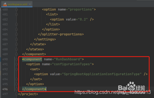 1.打开idea,在左侧项目展示栏中找到.idea,双击打开.idea2.在.idea下双击打开workspace.xml3.编辑workspace.xml文件,在结尾添加如下配置代码<component name="RunDashboard"><option name="configurationTypes"><set><option value="Sp