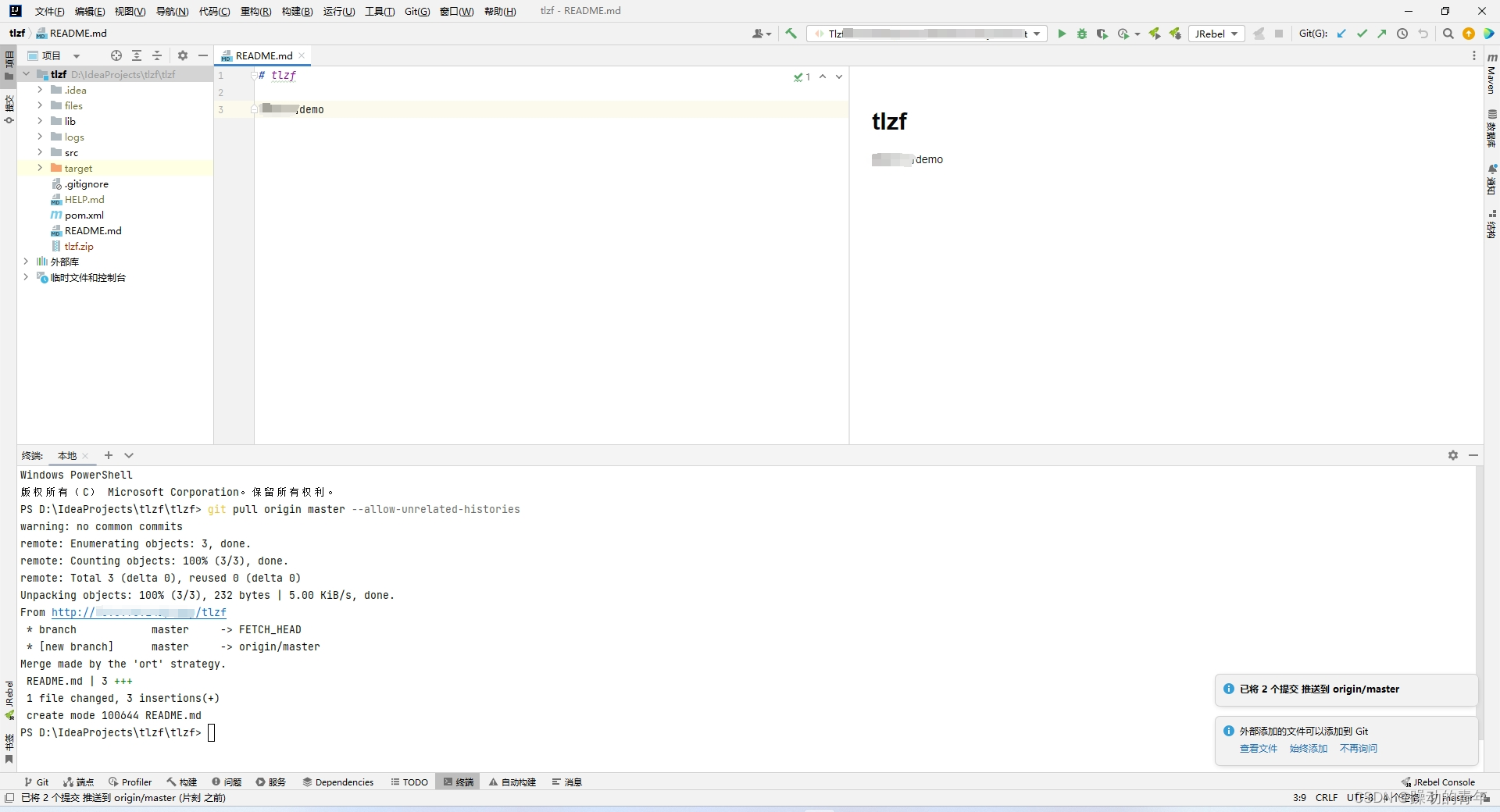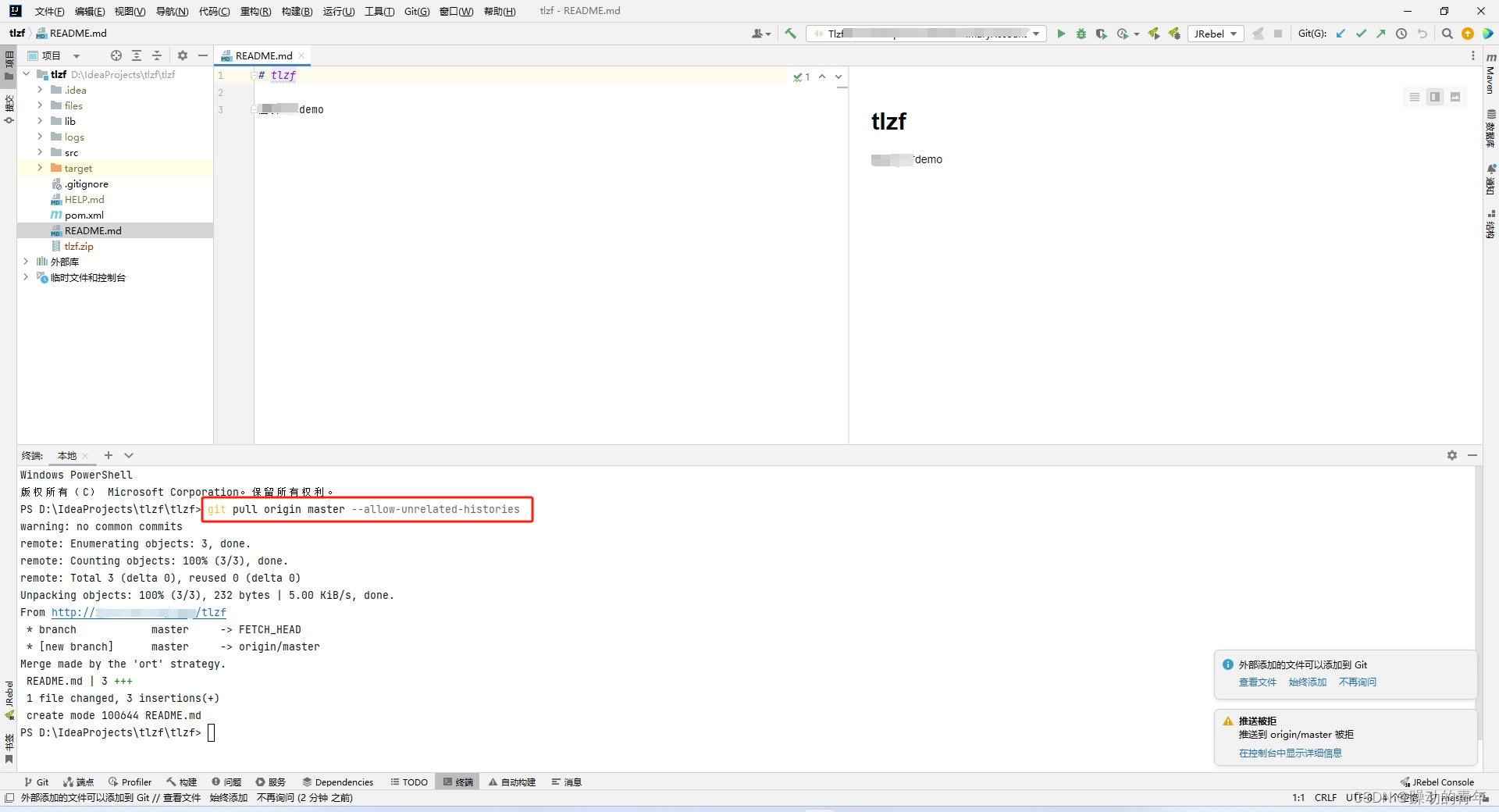 idea 上传项目到gitlab(git)报错解决办法git pull origin master--allow-unrelated-histories