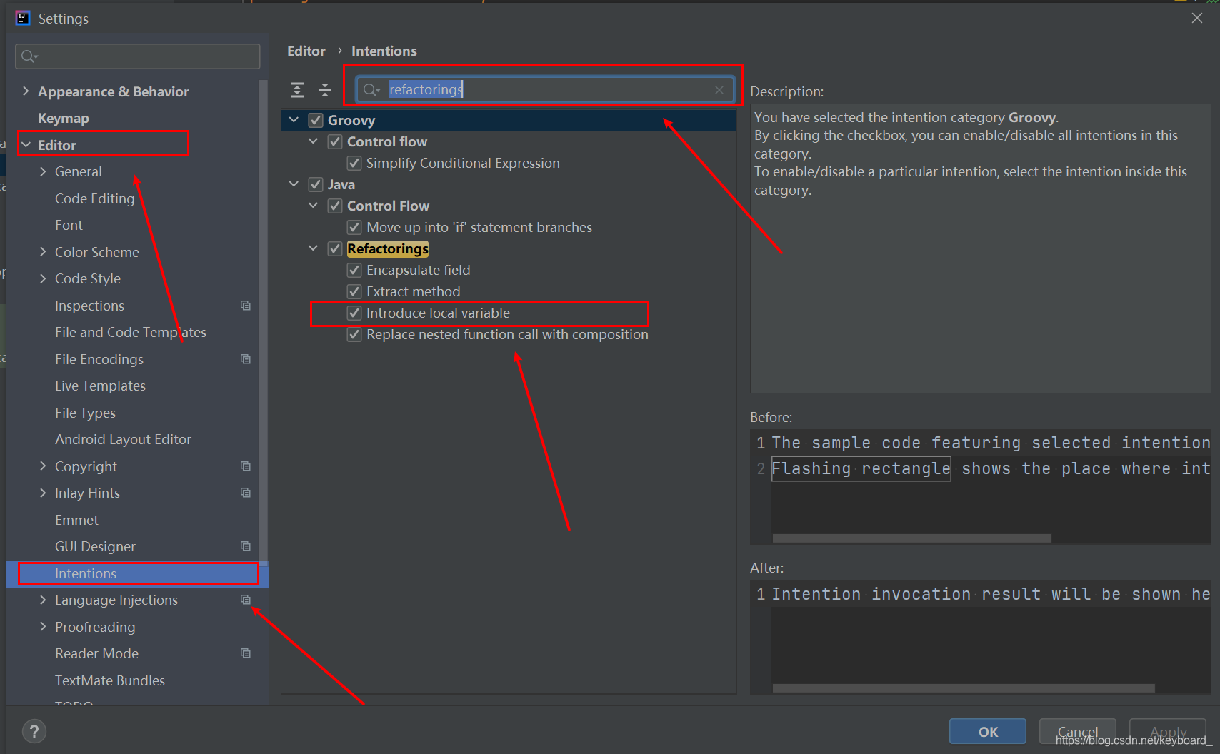 第二步:点击Editor,找到Intentions,在搜索框中输入refactorings,将Introduce local variable这个选项勾选上。操作如下图所示:
