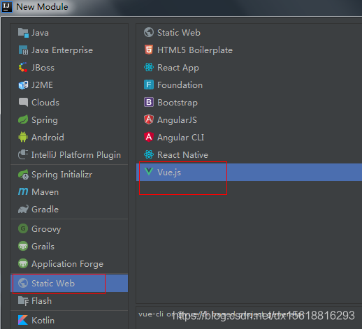 新建model的时候选择静态web项目中的VUE.js,如果没有vue.js,就需要去安装插件
