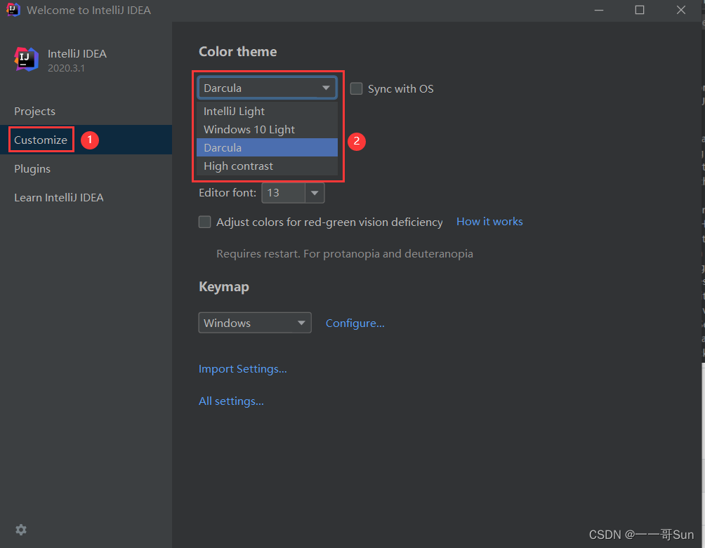 小伙伴们可以在这里可以根据个人的喜好选择自己喜欢的主题风格,我个人比较倾向于炫酷黑,另外你也可以在网上找一些其他更漂亮的主题下载,导入到IDEA中,这都是可以实现的。
