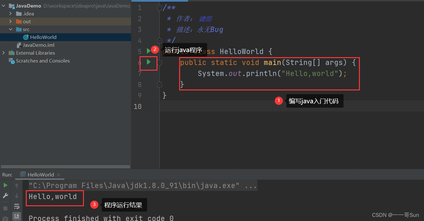 利用Intellij编写出一个HelloWorld案例并运行出结果。