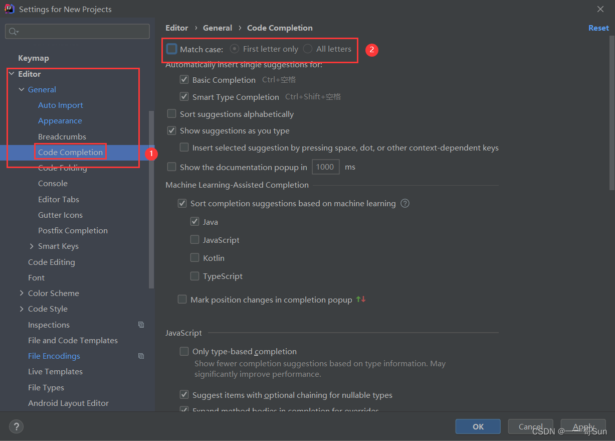 IDEA比较厉害的一个功能就是代码的自动提示,这一块必须设置好,一般勾选”First letter only“即可。