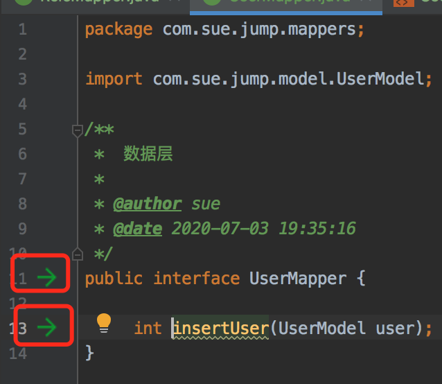 安装了该插件之后,在UserMapper接口的接口名和方法名的左边,会多了两个绿色的箭头,我们点击该箭头,就能跳转到UserMapper.xml文件对应的mapper标签或者insertUser语句上。