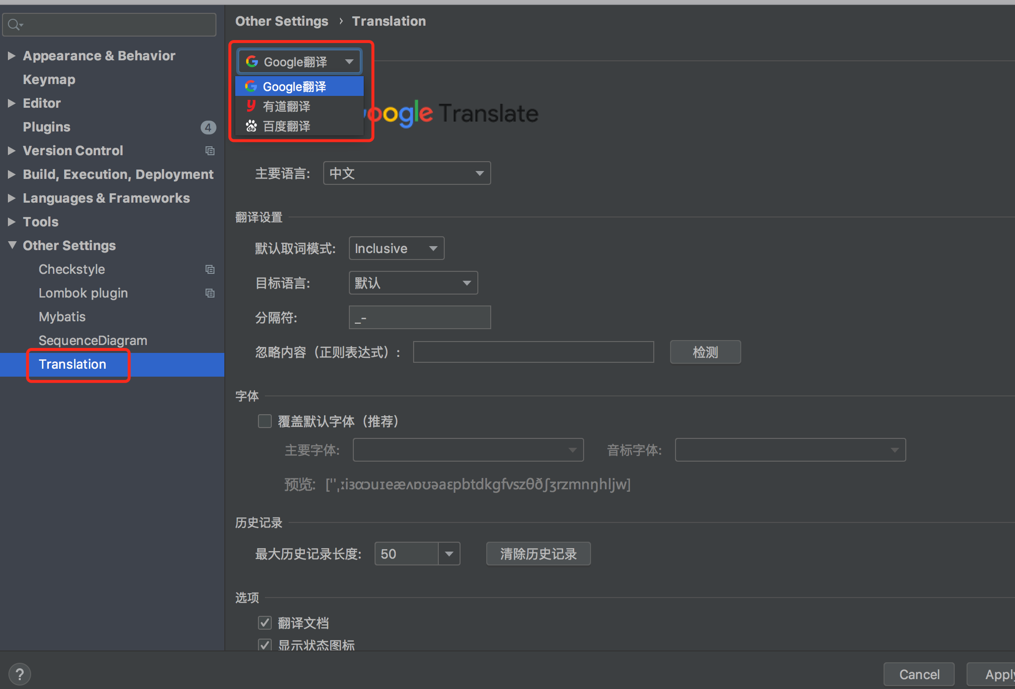 安装完Translation插件之后,在other settings中多了一个Translation菜单。