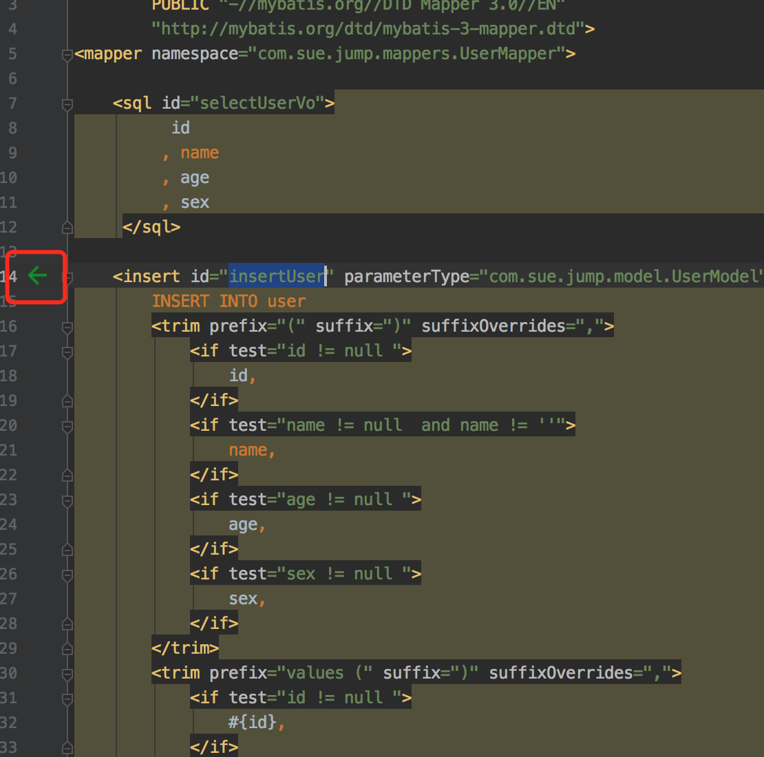 此外,在UserMapper.xml文件的insertUser语句的左边,也会多出一个绿色的箭头,我们点击该箭头,也能跳转到UserMapper接口的insertUser方法上。