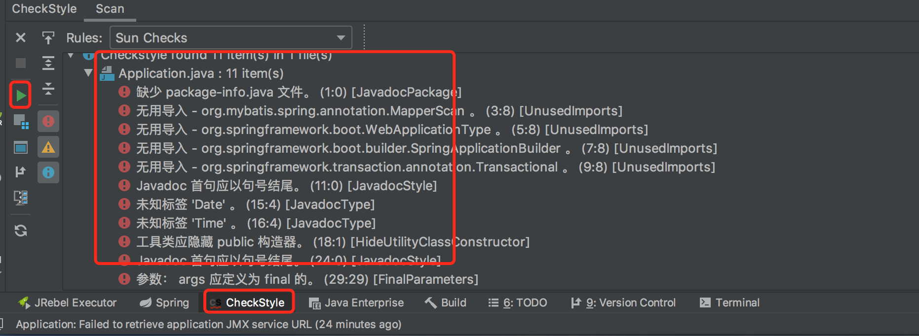点击左边的绿色按钮,可以扫描代码。在中间位置,会显示不符合代码规范的原因。