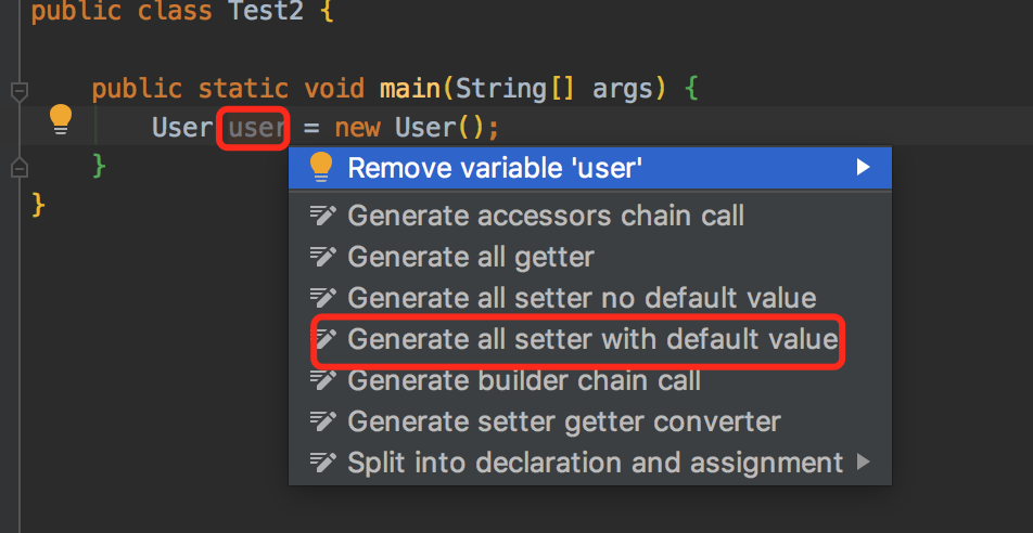 该User类中包含了:成员变量、getter/setter方法、构造方法、equals、hashCode方法。