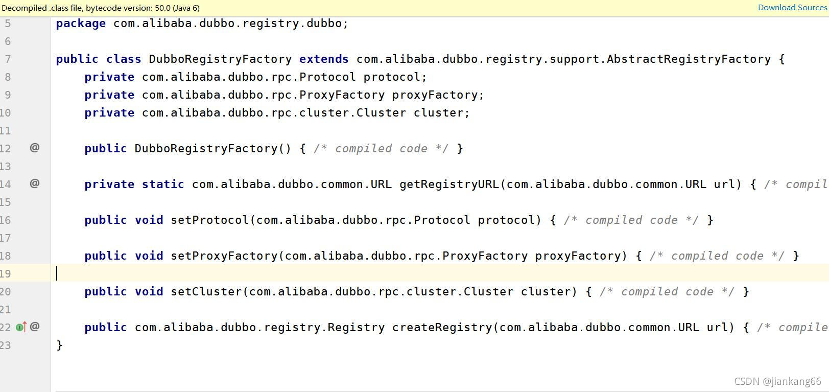 一、背景最近在工作中想jar包源码的具体实现,但是发现通过idea点进jar中,方法的实现显示不出来,全都显示/* compiled code */ ,如下,这种情况我们无法阅读源码。同时后面分享一下idea的常用快捷键。二、解决方案通过点击file-setting-plugins,搜索 Decompiler。将其选中,重启idea,就可以解决问题。最终效果如下,我是通过idea查看的dubbo的
