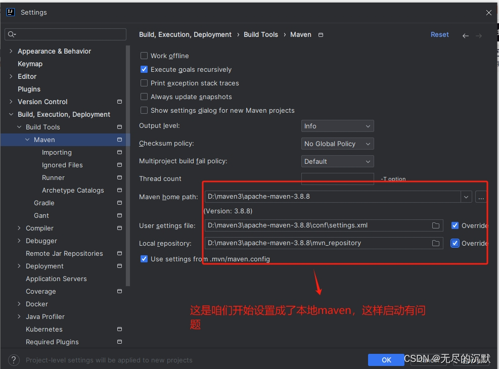 这个时候有src目录了,但是报没有插件的错误,这个时候就可以,将idea的maven设置成本地的maven配置,点击ok,错误就解决了,如下图
