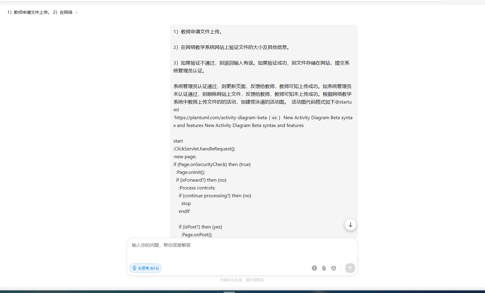 摘要:本文介绍利用IDEA插件PlantUML与KimiAI快速生成UML图的方法。首先在IDEA中安装PlantUML插件并创建目标UML文件(如活动图),获取代码模板;随后通过KimiAI输入需求描述和代码格式,生成对应UML代码;最后将AI生成的代码替换至IDEA文件中即可自动生成图形。该方法支持多类UML图绘制,生成结果可复制或导出,大幅提升绘图效率。