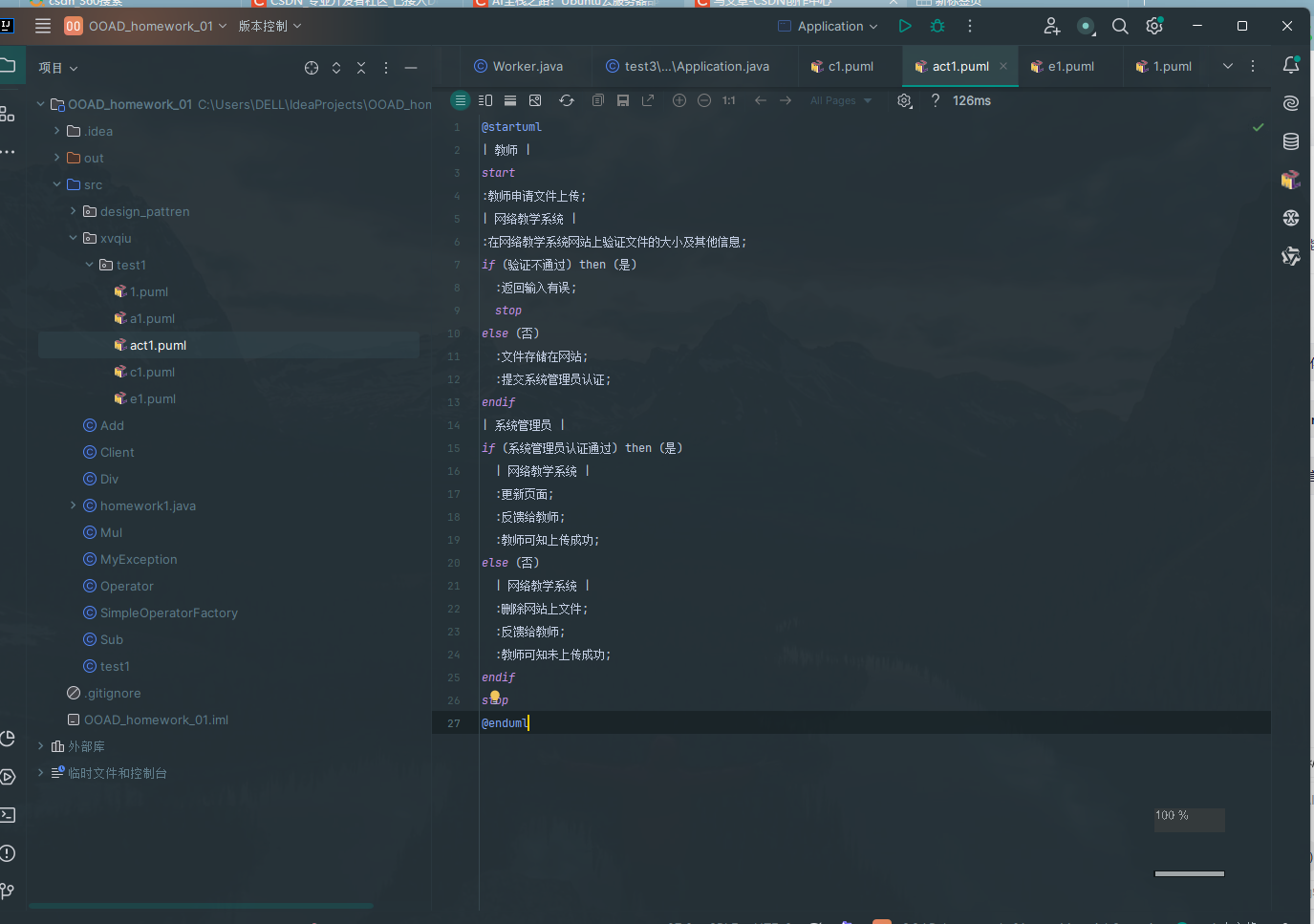 3.将生成的UML图代码复制到idea创建的UML文件中,将原来的示例代码替换成kimi给出的代码,如下