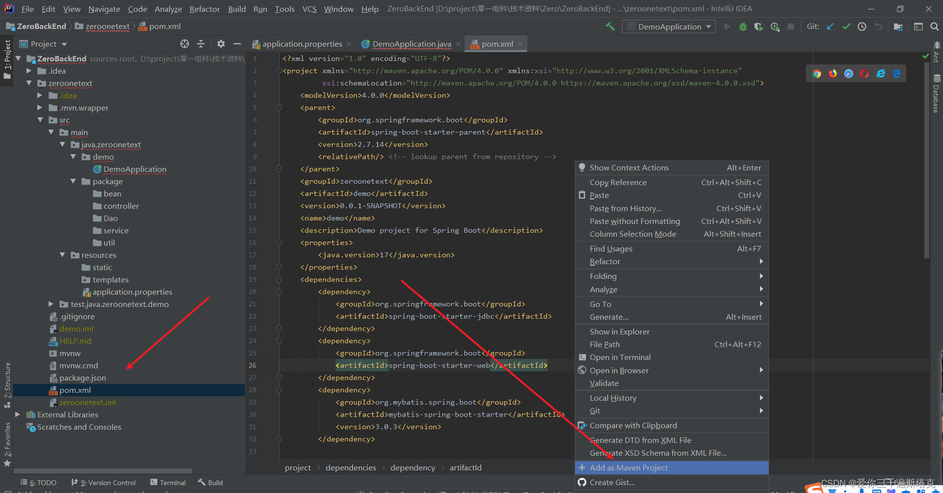 5、如果上面没有Maven结构,那就到pom.xml文件,鼠标右键选择 Add as Maven Project,如下图所示,点完这两部,maven就会顺利的出来了,如下下图所示