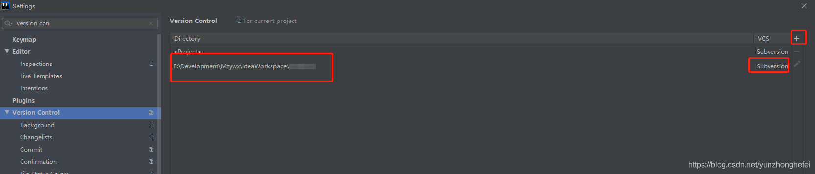点击“+”进行增加设置,vcs选择Subversion,如图: