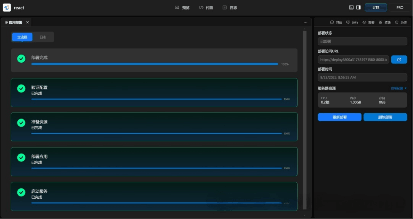 ③一键部署 - 只需一键操作,即可快速完成系统上线,摆脱繁琐环境配置,让开发到交付更高效。
