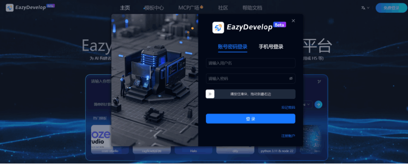 ①注册登录 - 进入 EazyDevelop 平台网站,完成账号注册并绑定手机号,即可开启专属体验。