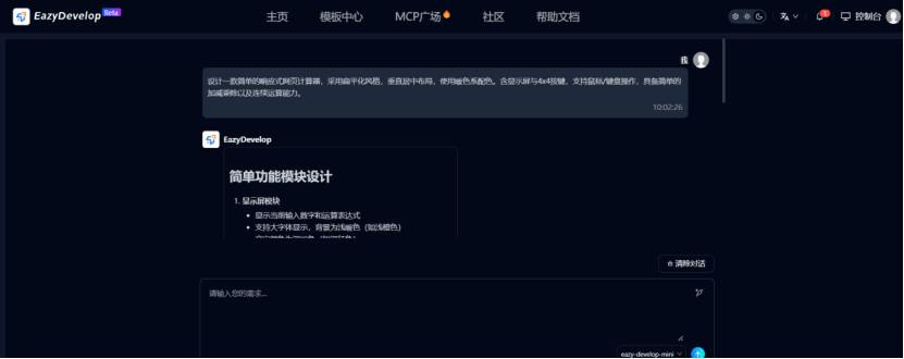 ②即刻开始 - 在工作台中点击即刻开始,输入自然语言需求,例如“我要做一个计算器”,平台会自动拆解并生成对应的架构方案。