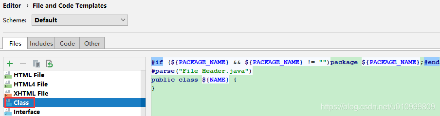 对于File and Code Templates中的Files和Includes选项卡,