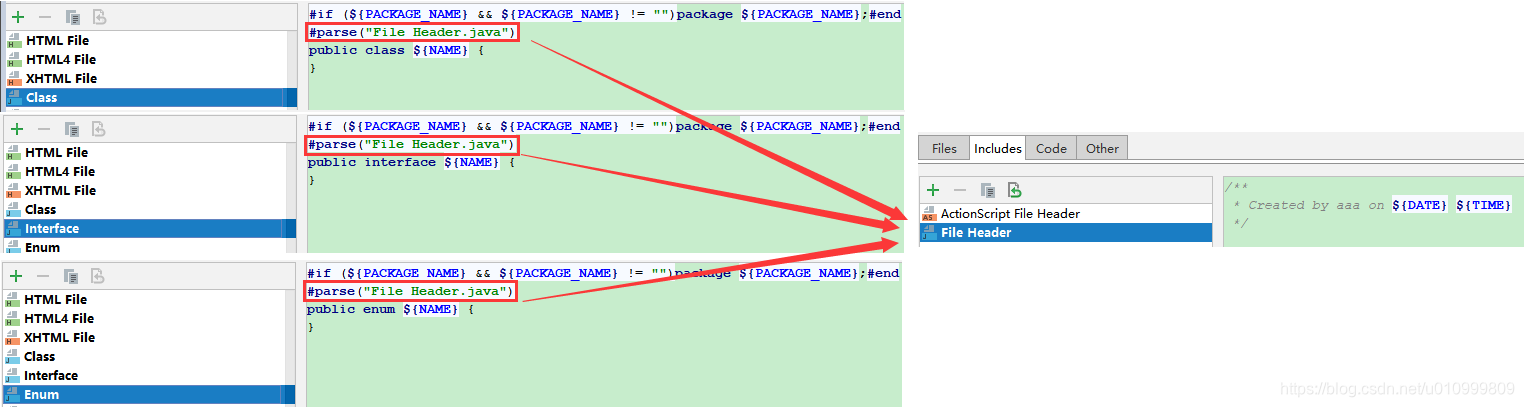 不建议直接改Files选项卡的内容,最好是把公用的地方抽出来,放到includes选项卡里。比如说:Class、Interface、Enum基本上都会共用相同的File Header注释,像下面这样,我只要修改File Header,这几种java文件的头部注释都会跟着变化