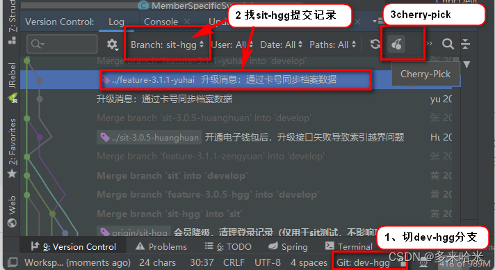 sit-hgg分支提交后,切换dev-hgg,然后再version control中选sit-hgg分支提交记录,cherry pick后push上去——————OK perfect!!就这么简单
