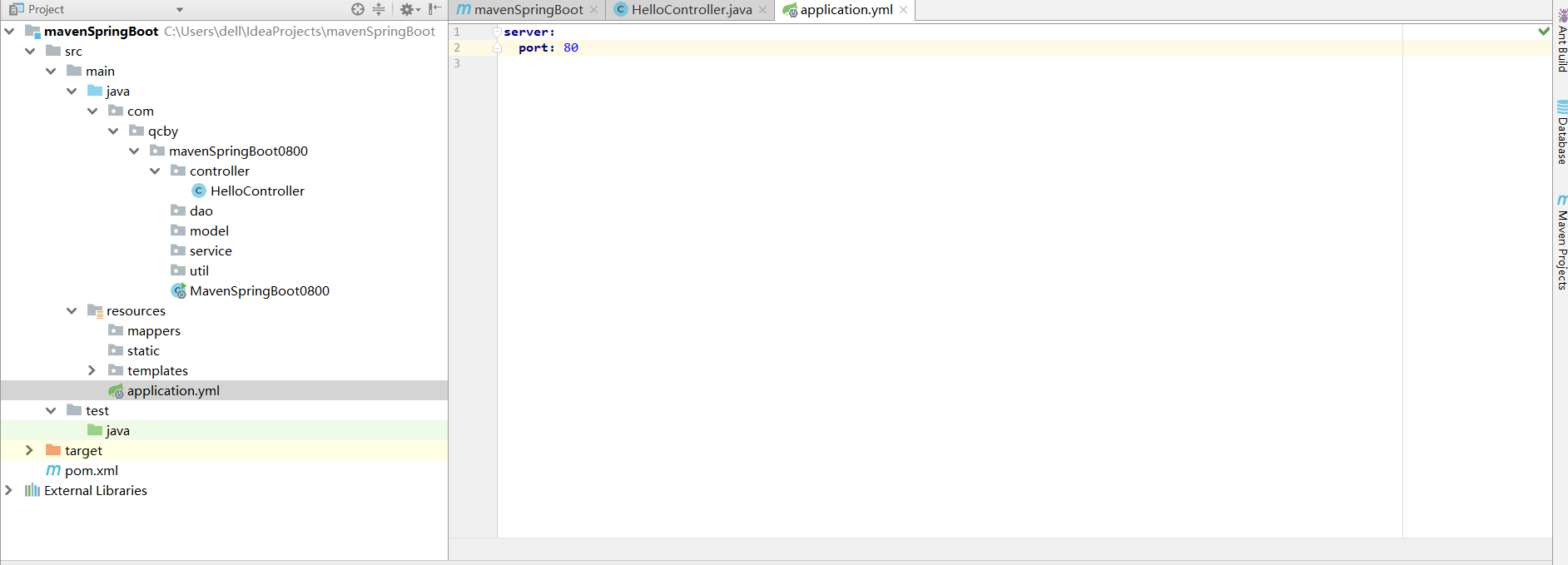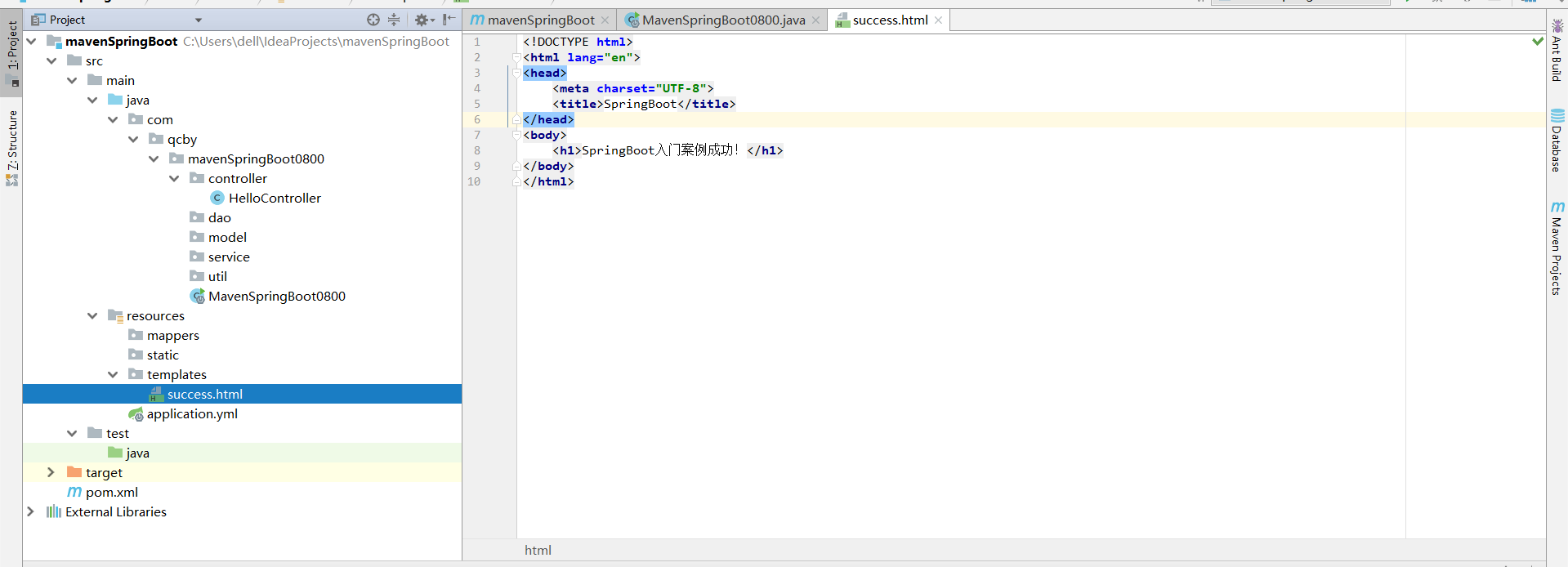 这样就运行了这个简单的mavenSpringBoot项目,可以知道mavenSpingBoot与mavenJavaWeb的区别是后者需要自己配置tomcat服务器,而前者已经自动配置好了(可以看下方的倒数第五行),就是包括好了不用自己配置了。