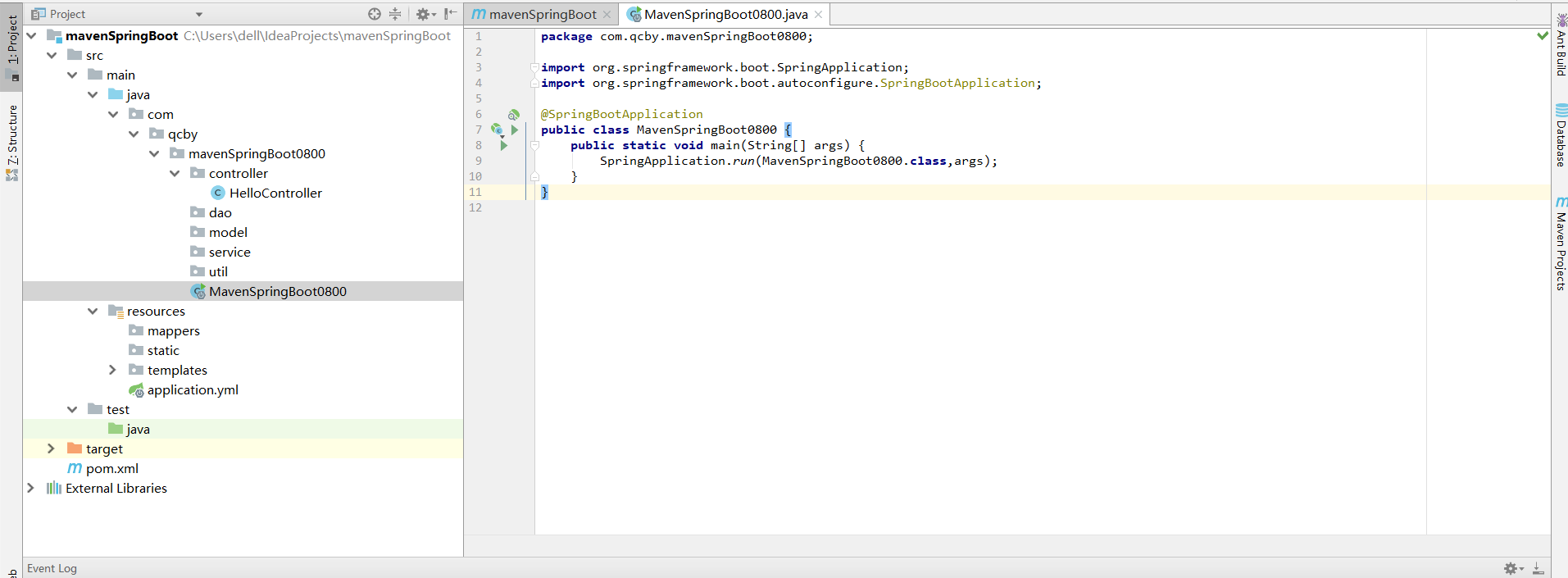 之前运行SpringBoot工程需要一个类,这个缺不了,自己手写一个就行了,建议按照之前的目录结构来创建,先别玩花样,先学走后学跑。类名可以自定义,关联的名称一切修改即可