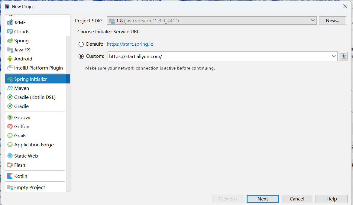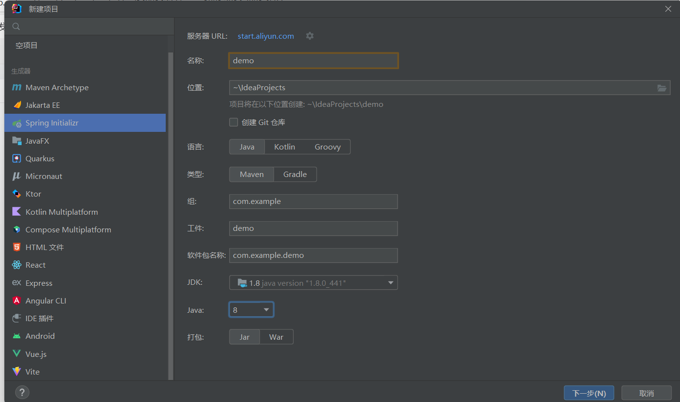 选择Spring Initializr后,jdk选择版本后,选择Custom然后输入https://start.aliyun.com/