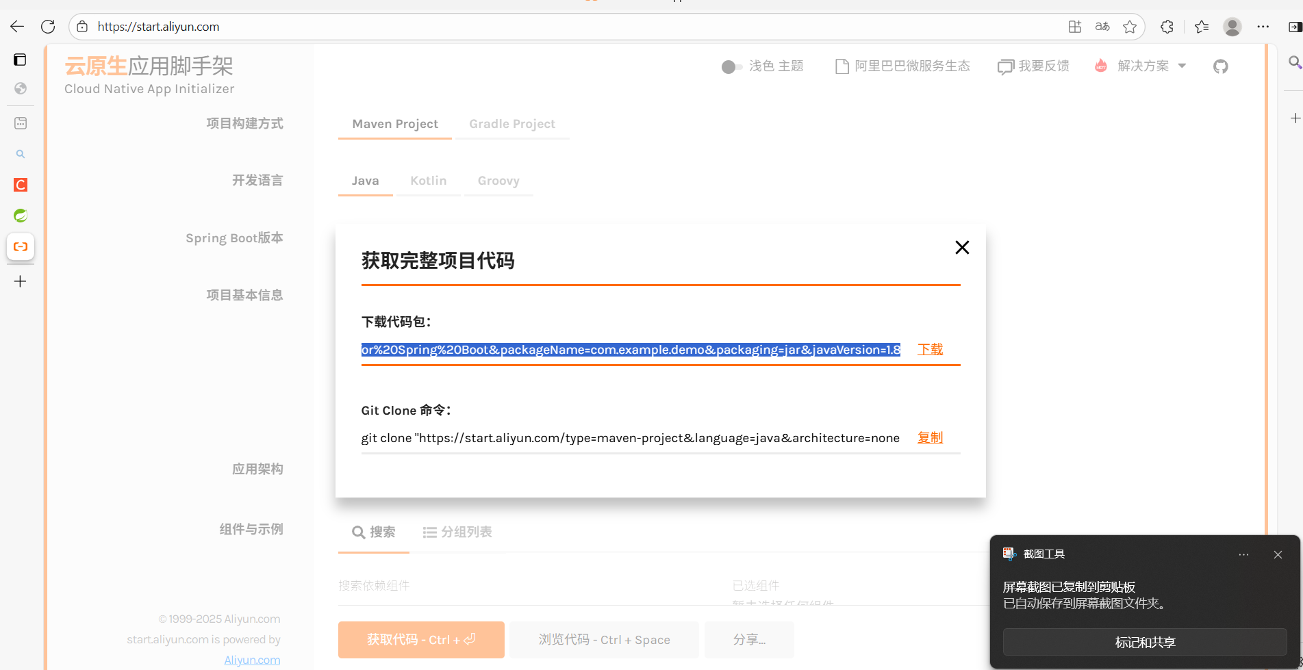 方式二:Idea从阿里云的官网(https://start.aliyun.com)下载打开