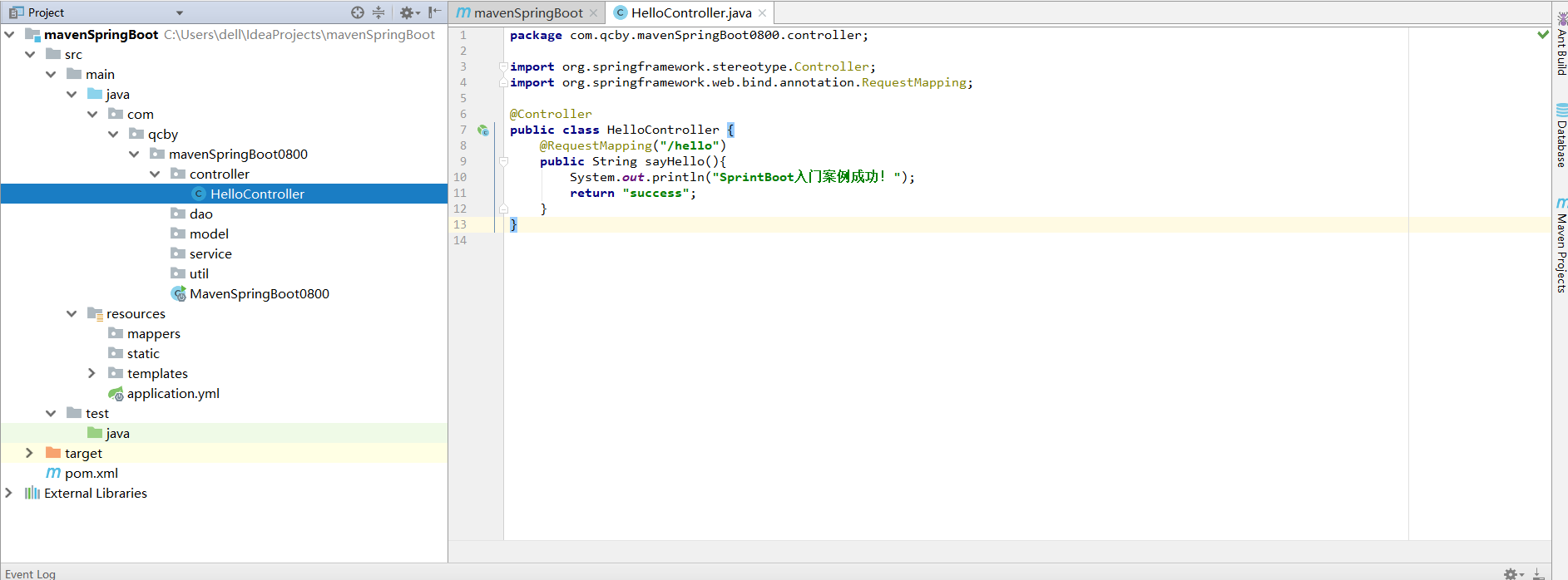在controller文件夹下编写对应的响应HelloController.java,并输入内容如下图所示