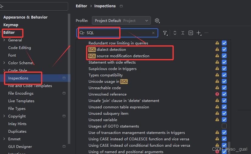 我们在使用idea开发的时候,老碰到xml中有黄色下划线,这个是因为idea需要配置数据库方言,但是配置了有时候会出现很多莫名其妙的问题,那我们不配置数据库的情况下如何去除下换线呢?直接上步骤: