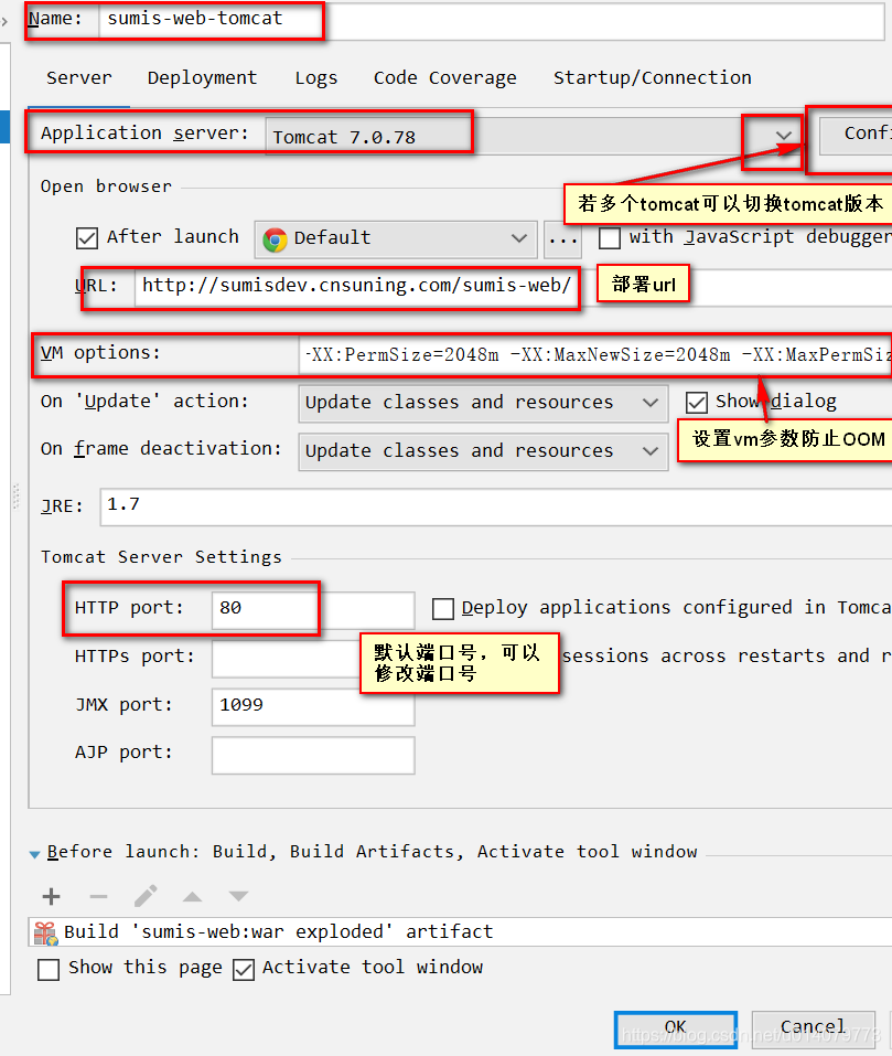 idea配置服务器(tomcat或jboss)案例一:idea配置tomcat服务器首先添加tomcat服务器配置tomcat部署备注:勾选"After launch"则项目启动后自动用chrom浏览器打开VM options配置jvm参数,解决tomcat内存溢出问题,参数如下:-Xms1024m -Xmx2048m -XX:PermSize=1024m -XX:MaxPermSize=2048