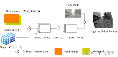 利用低分辨率分支预测的双边网格系数B,我们现在需要将该信息传输回原始输入的全分辨率空间,以产生高质量的去雾特征。为此,我们引入一个双边网格切割操作,以指导地图和学双边网格执行视数据查找的网格如图3所示,我们使用三线性插值网格数据插入指导张量和使用额外的卷积来获得高质量的特性。首先,构造两个具有坐标制导的映射,并将它们与制导矩阵的维数相同叠加成一个张量;其次,用双边网格填充导频张量的坐标位置,并使用三线性插值构造一个与双边网格深度相同(12通道)的张量。下一步是用一个卷积层来压缩张量,卷积层的核大小为3 × 3,步长为1,深度为3,我们称之为系数张量。最后,我们将系数张量与全分辨率朦胧输入相乘,构建新的高质量特征。