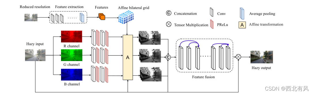 图2:本文提出的单图像去雾方法的结构和配置,包括三个部分。第一步从低分辨率系数预测流开始,该流使用特征提取块和下采样层来拟合仿射双边网格。然后利用三个制导矩阵和仿射双边网格插值得到不同的高质量特征。最后,该特征融合块将三种高质量特征与全分辨率输入作为四种异构数据进行融合,得到去雾结果。