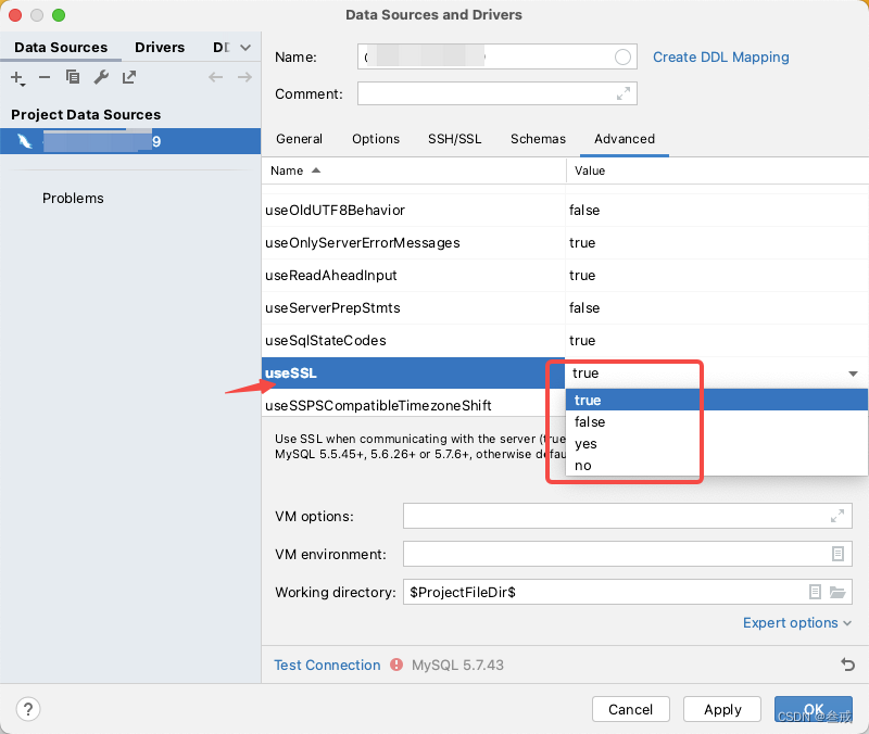 2、如果1未解决,idea数据库配置界面advanced选项useSSL设置为"false"或"no"
