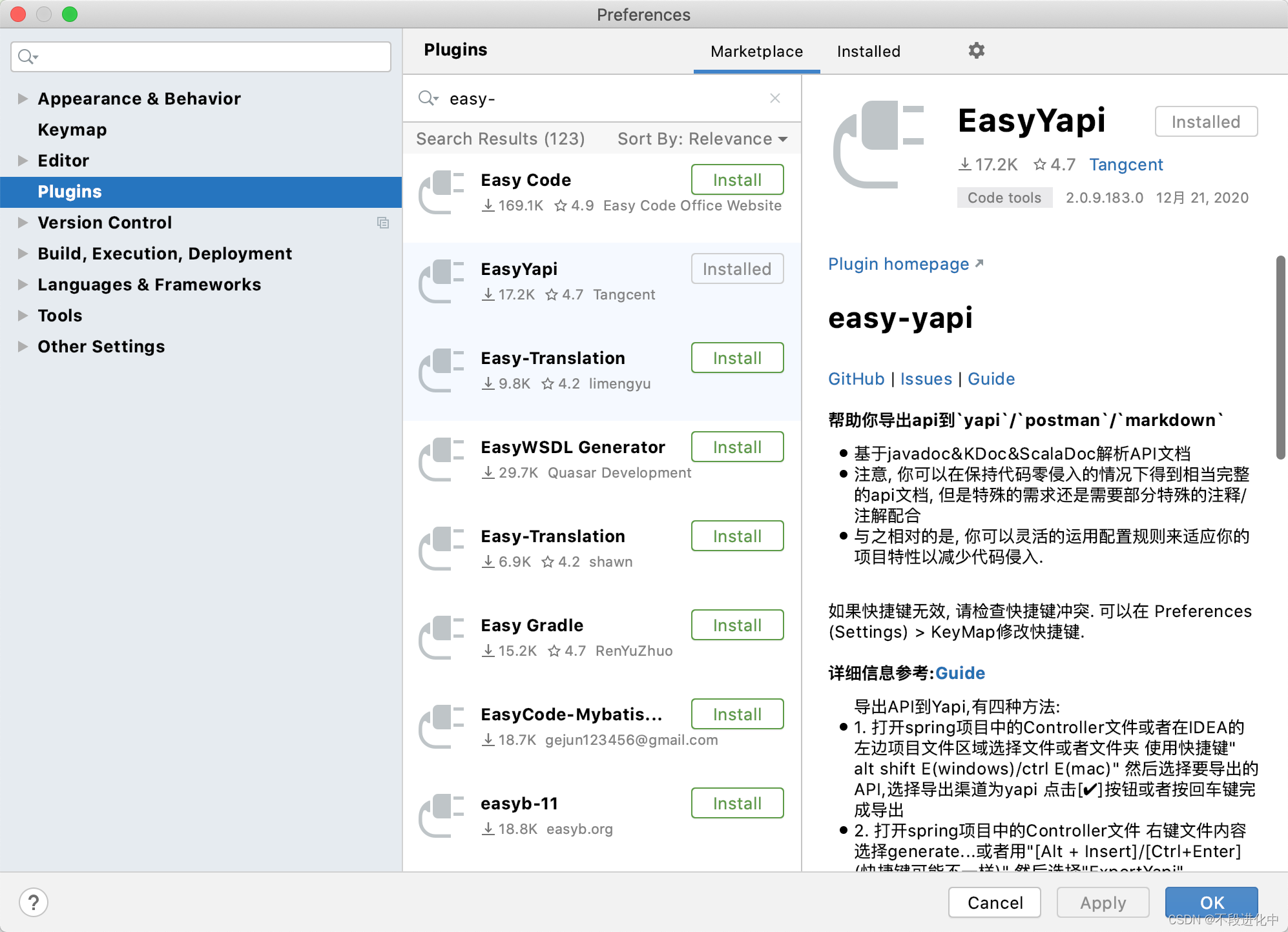 1、打开IDEA → Settings → PLUGIN - > 搜索 EasyYapi → 然后进行安装