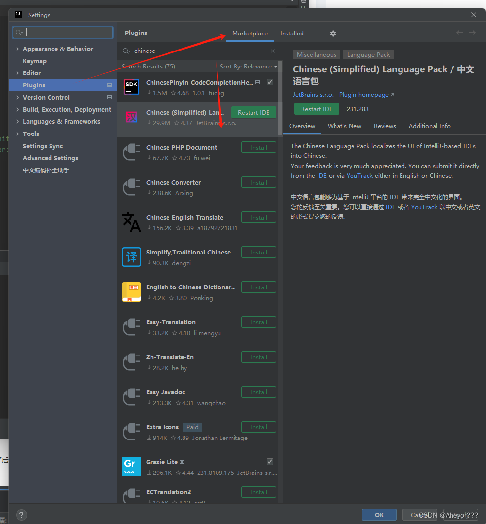 Ctrl+Alt+S快捷键打开Settings界面选择Plugins在搜索部分搜索chinese,选择下方的Chinese(simplified)Language下载最后重启软件即可