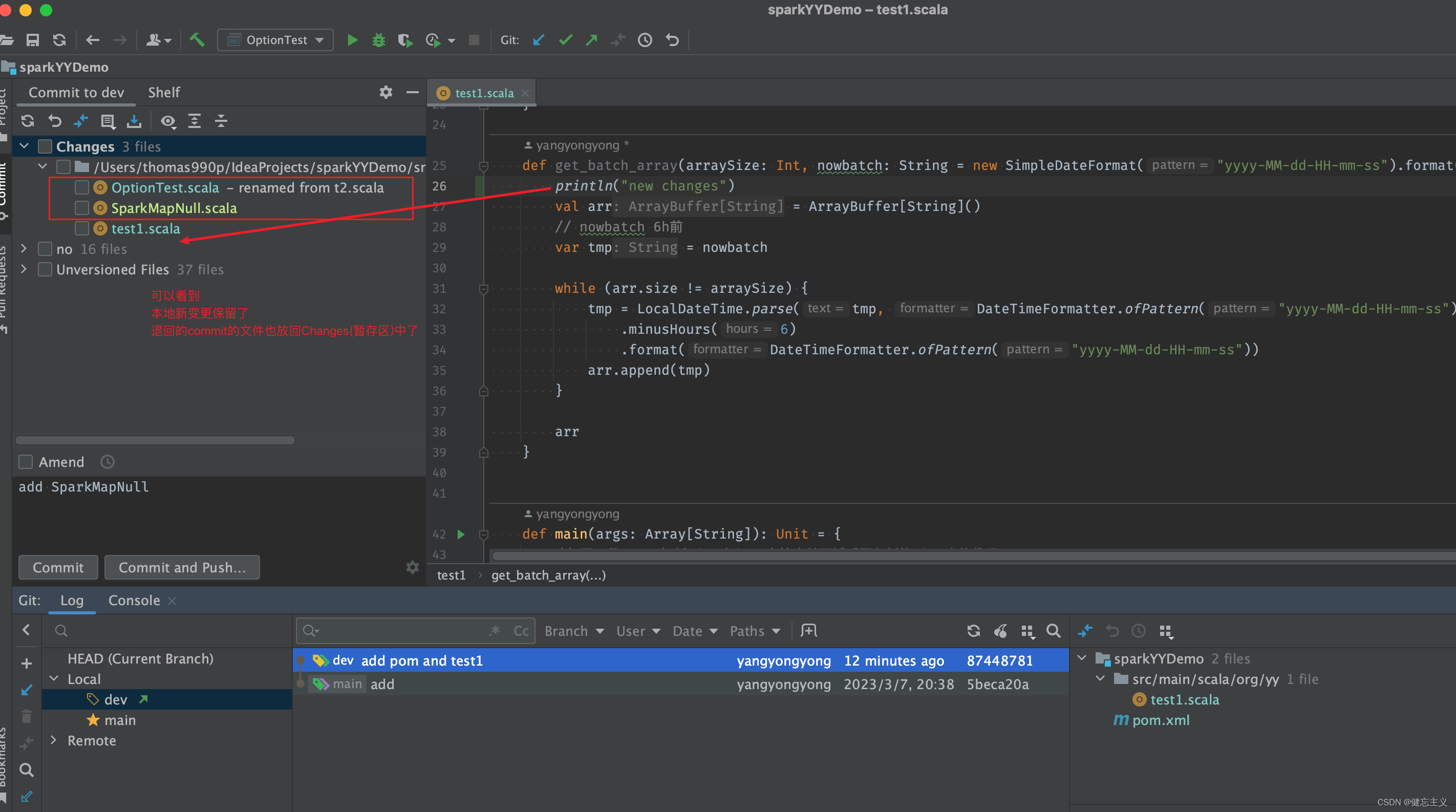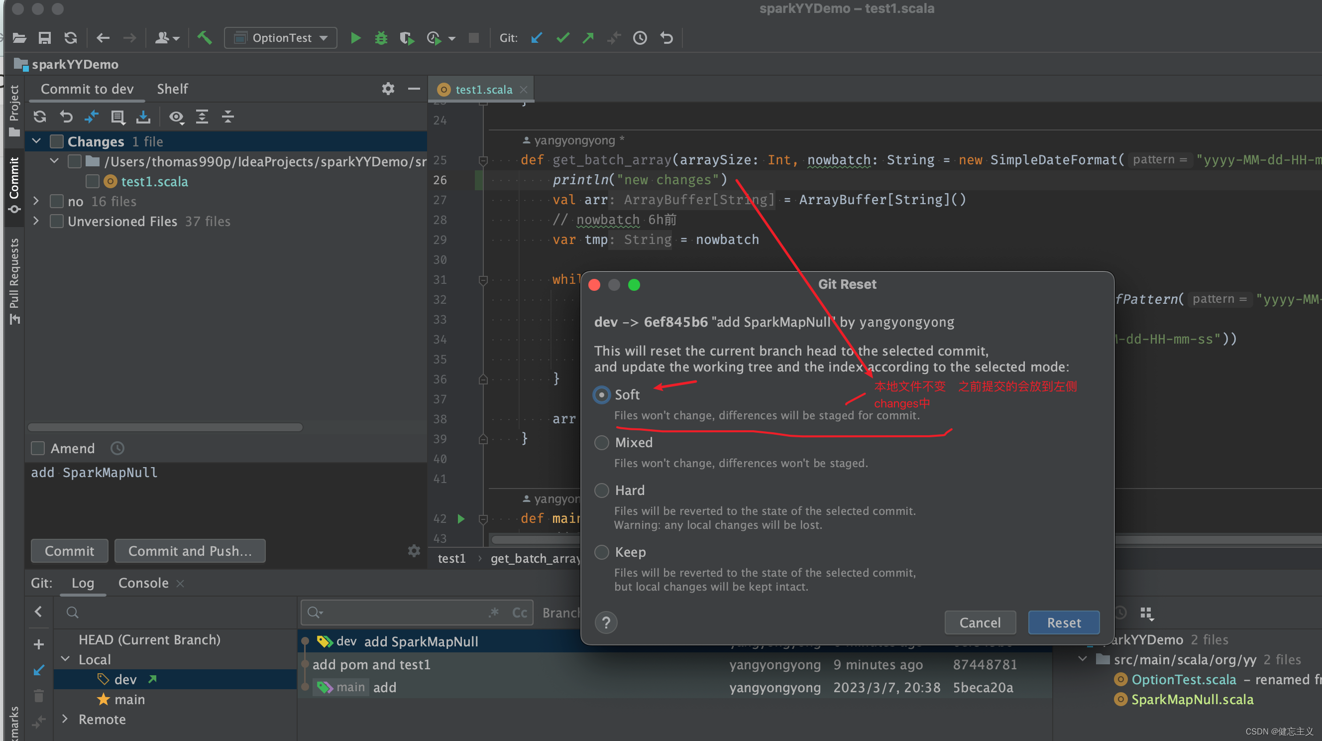 如果选择mixed 那么 撤回的提交设计的所有文件都会放到工作区,但是没有放到stage(暂存区)即项目中可见,但是不在左侧commit的Changes列表中.下图向右的箭头指错了 应该是左侧第二个commit对应的文件变更。这个在代码评审的时候特别方便 评审通过在commit一下即可。