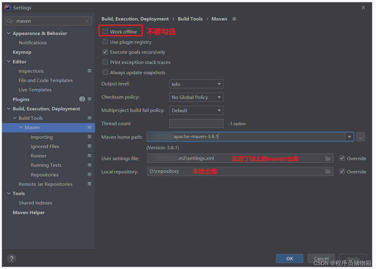 扩展:work offline ,脱机工作,也可以称为离线模式。默认情况下,Maven连接到远程存储库,并在每次启动时检查更新。解决Maven依赖关系可能需要下载新的工件。如果希望Maven仅使用本地可用的那些资源,则可以切换到离线模式。