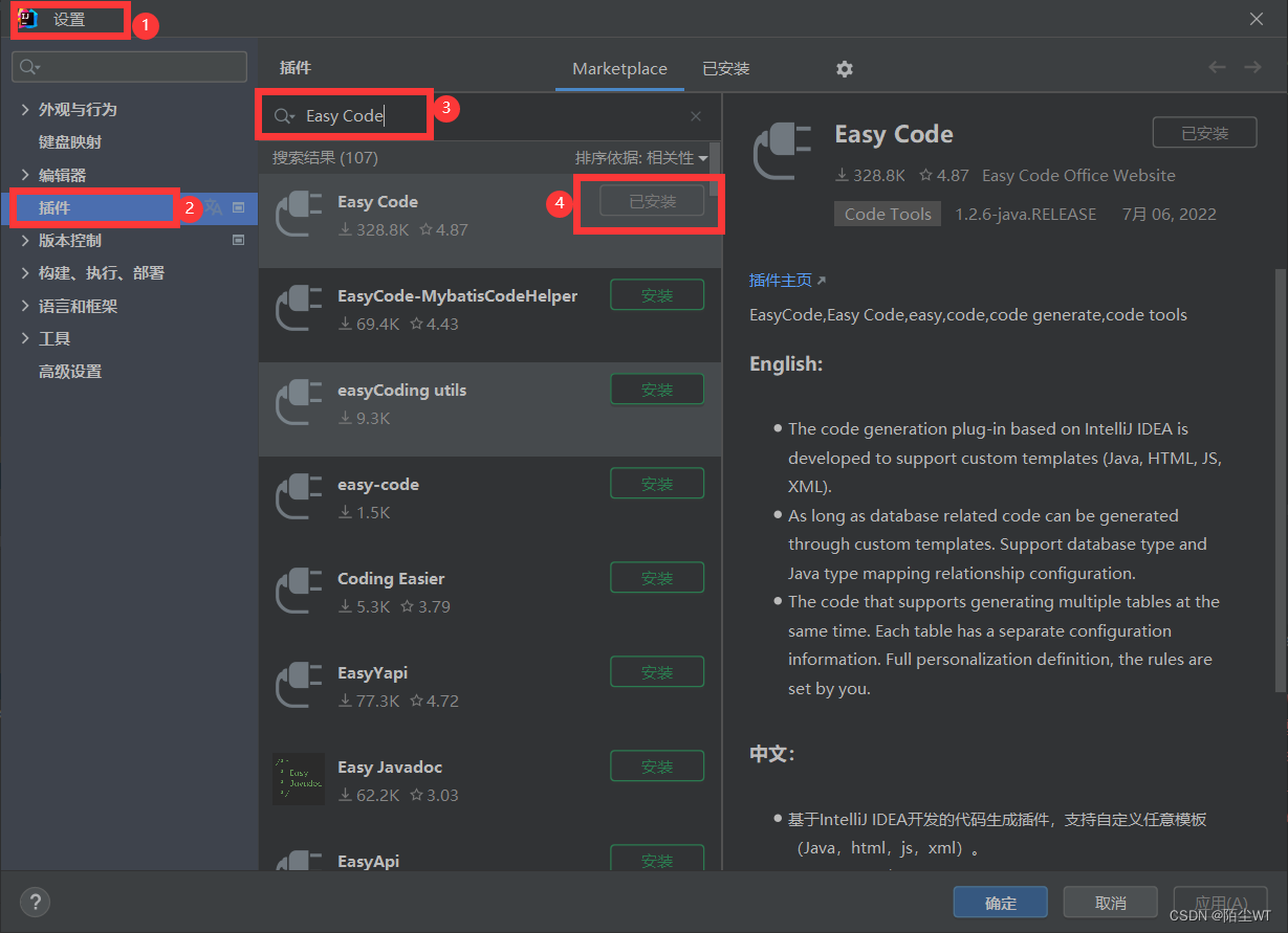 在idea打开:设置–>插件–>Marketplace–>搜索 easy code–>安装–>应用确定。这样子就安装成功了。
