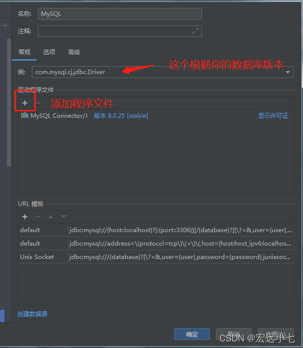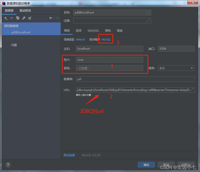 点击MySQL之后,先填用户名和密码,然后把项目所要用到的数据库写在url中,就是JDBC的url,写完选择驱动程序。